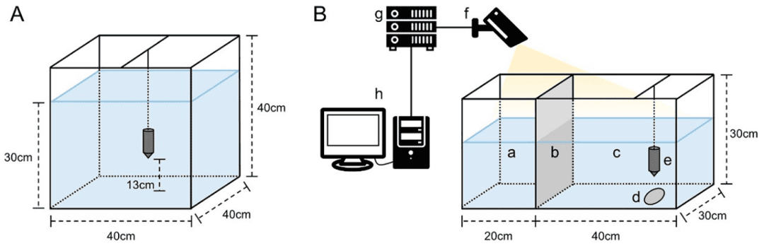 Figure 1: The sound recording system (A) and the feeding observation system (B). Note: isolation area (a), partition (b), observation area (c), feeding tray (d), hydrophone tube (e), infrared camera (f), switch (g), monitoring screen and storage device (h).