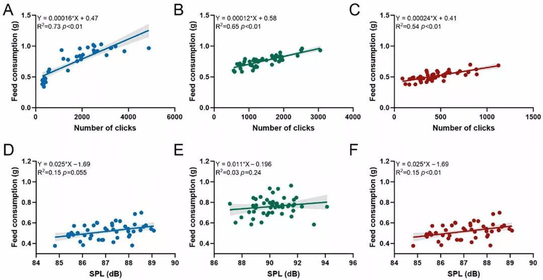 Figure 2: Relationship between feed consumption and the number of clicks (A–C) and sound pressure level (SPL, in dB) (D–F) within 30 minutes after feeding with pellets, under different temperatures, ammonia nitrogen concentrations, and nitrite nitrogen concentrations.