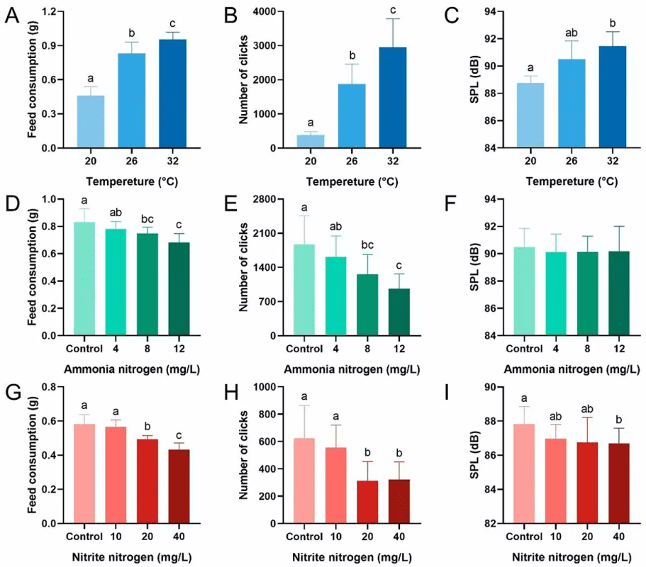 Figure 3: Differences in feed consumption, number of click sounds, and sound pressure level (SPL, in dB) of P. vannamei within 30 minutes after pellet feeding at different temperatures (A–C), ammonia nitrogen concentrations (D–F), and nitrite nitrogen