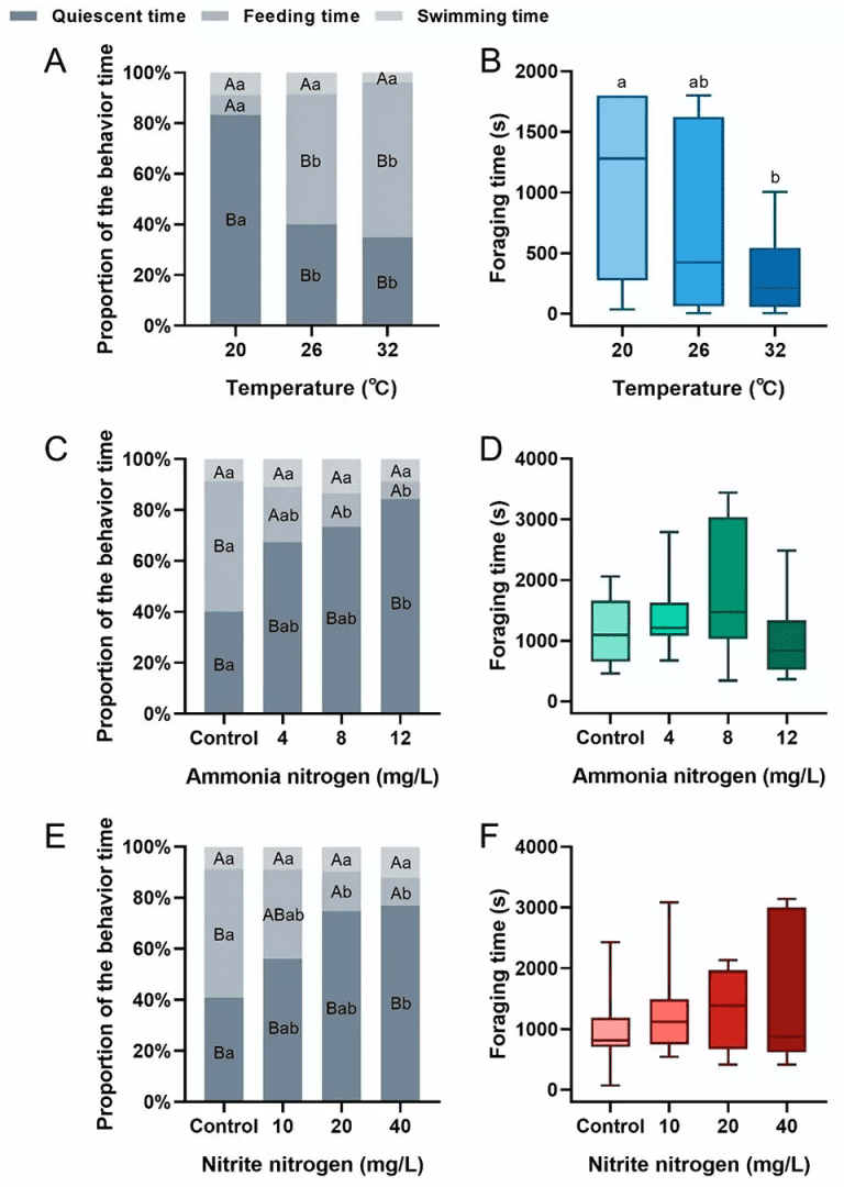 Figure 4: Proportion of behavioral time relative to foraging time of P. vannamei under different temperatures (A, B), ammonia nitrogen concentrations (C, D), and nitrite nitrogen concentrations (E, F). Different uppercase letters represent significant differences among behaviors within the same treatment, while lowercase letters represent significant differences for the same behavior across treatments.