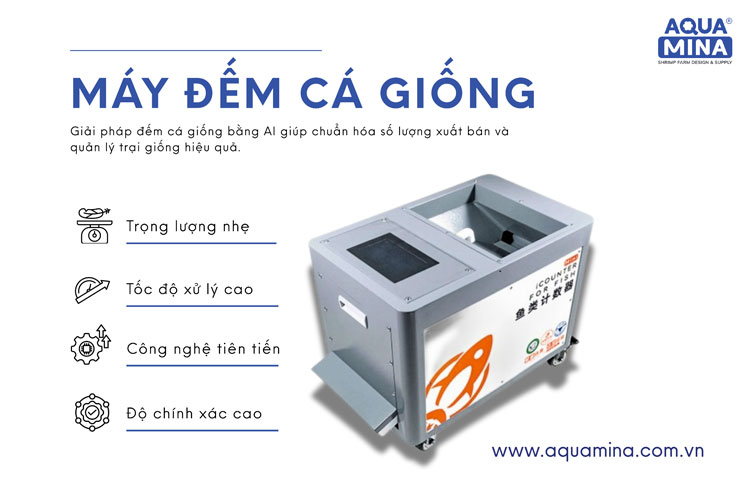 Cùng với máy thổi khí turbo, Aqua Mina còn mang tới sản phẩm Máy đếm cá với độ chính xác lên tới 99%. Nhờ sử dụng công nghệ trí tuệ nhân tạo, nhận diện và loại bỏ các con giống đã chết giúp tăng số lượng đếm chính xác hơn. Máy đếm cá có thể sử dụng trong các trại cá giống với độ linh động các size cá khoảng từ 1mm tới 20cm. Số lượng tối đa mỗi lần đếm lên tới 10.000 con và lịch sử các lần đếm được ghi nhận đầy đủ giúp quản lý số lượng giống tốt hơn.