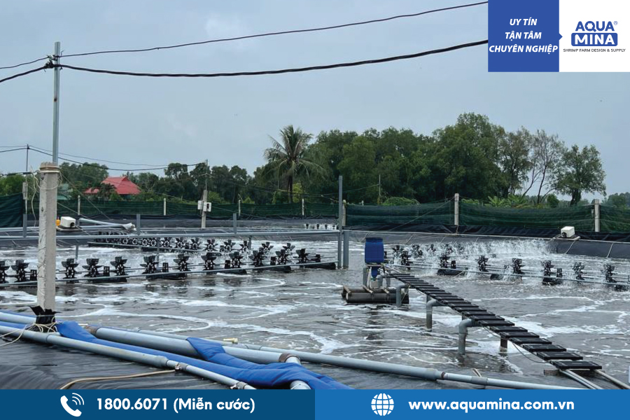 - Trong dự án này, Aqua Mina lựa chọn máy thổi khí Turbo công suất 22kW, sử dụng nguồn điện 3 pha, áp lực làm việc 25 kPa, kết hợp hệ thống vòng treo khí để cấp khí đều khắp ao nuôi.