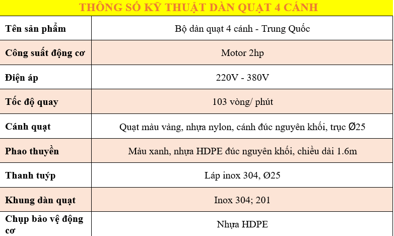 Bộ 4 cánh quạt nước đúc nguyên khối màu vàng; mỗi quạt có 8 cánh tăng tần suất, tăng cường oxy cho ao nuôi,giảm sự phân tầng nước,không còn lo sợ thiếu hụt oxy